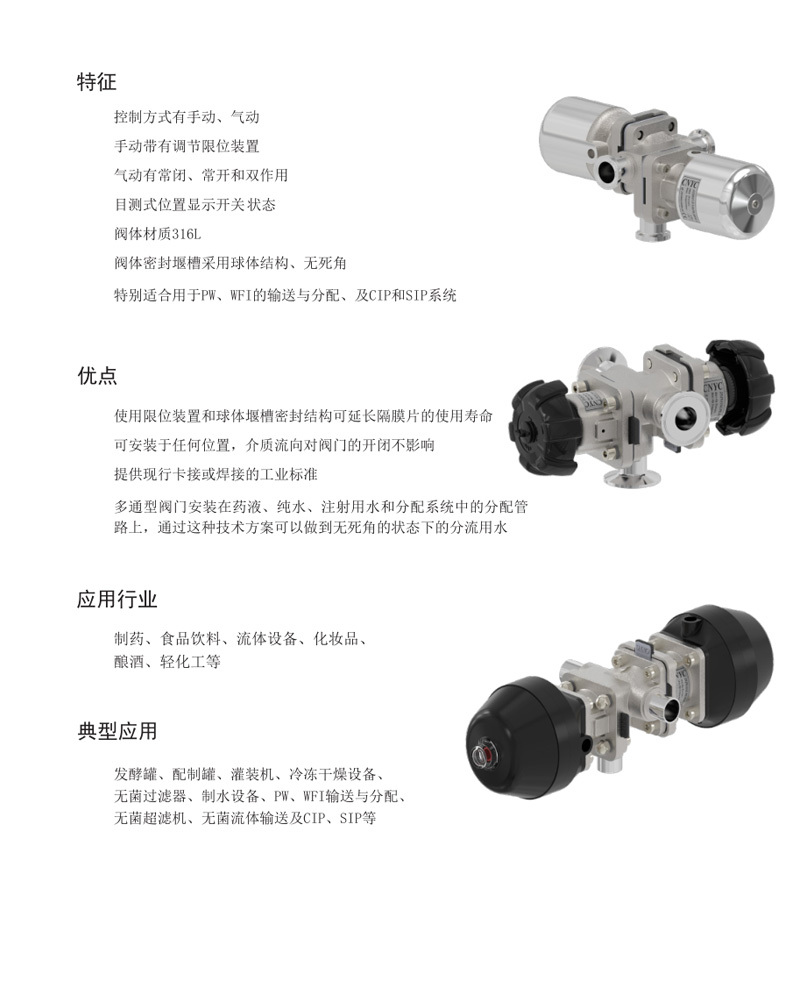 CNYC是公司(sī)産品使用的(de)品牌,系列産(chǎn)品包括了PTFE+EPDM隔(ge)膜片、隔膜閥(fa)、多通閥、閥門(men)定位器、過程(cheng)控制器及位(wei)置顯示開關(guān)等品種,規格(gé)齊備🥰,滿足了(le)FDA、USP、BPE 等相關标準(zhun)。